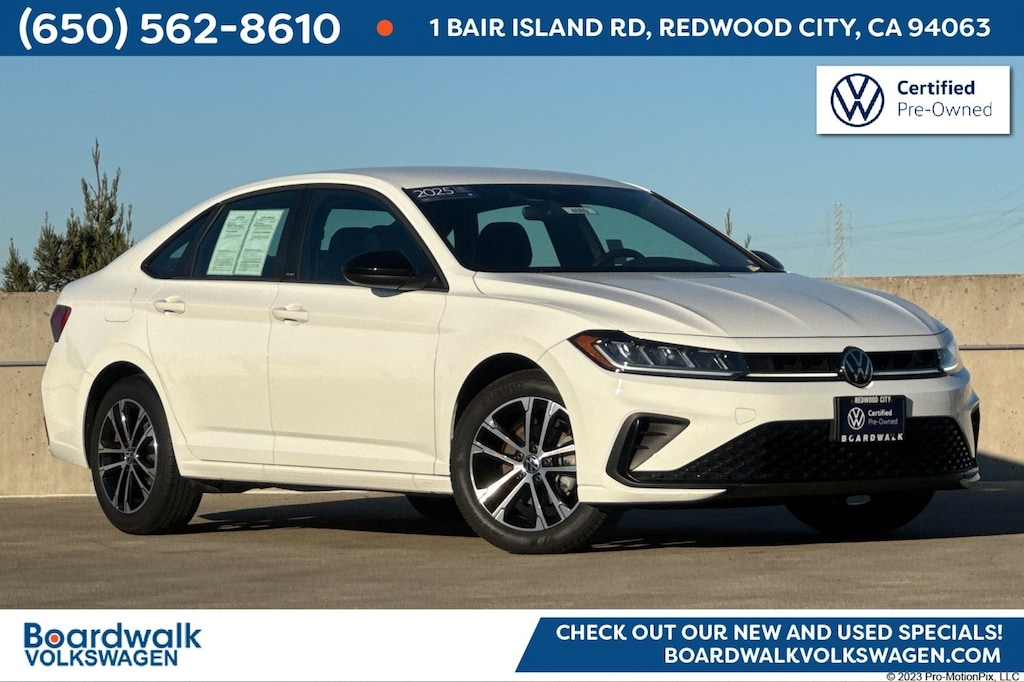 CARFAX One-Owner. Clean CARFAX. Certified. Pure White 2025 Volkswagen Jetta 1.5T Sport FWD. Powered by 8-Speed Automatic with Tiptronic and 1.5L I-4 DI DOHC Turbocharged Engine. Low Miles! Equipped with 4-Wheel Disc Brakes, Heated Front Seats, Radio: MIB3 Composition Color w/8" Touchscreen, Rear Parking Camera, VW Car-Net Safe & Secure (enrollment needed), VW Care, and 17" 2-Tone Machined Alloy Wheels.