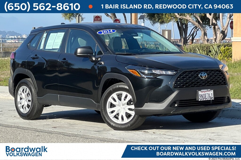 CARFAX One-Owner. Clean CARFAX. Jet Black 2024 Toyota Corolla Cross L. Powered by CVT and 2.0L I4 Engine. Equipped with All Weather Liners, Electronic Stability Control, Safety Connect (Subscription needed), Illuminated entry, 8" Touch-Screen Display Audio, Rear Parking Camera, Remote keyless entry, Spoiler, and 17" Steel w/Silver Wheel Covers.