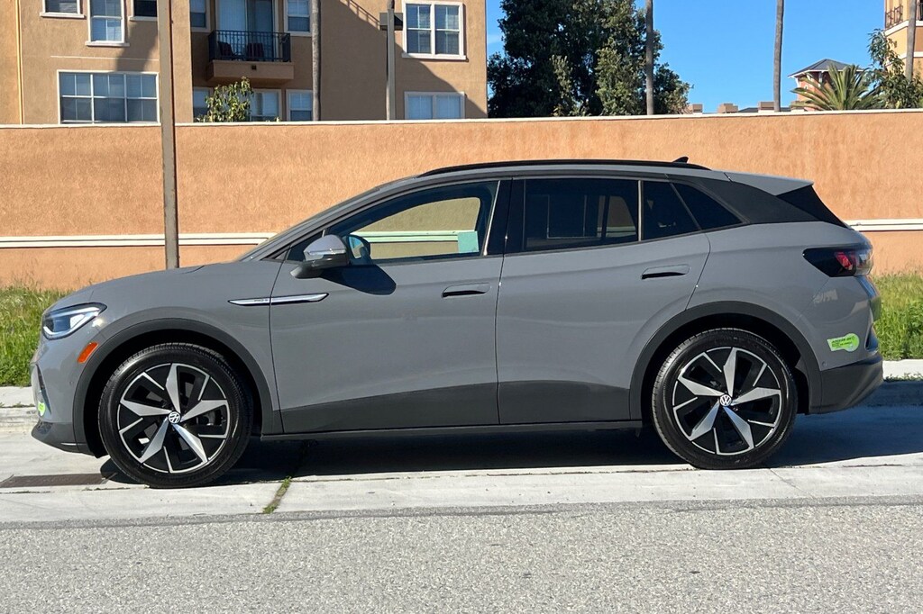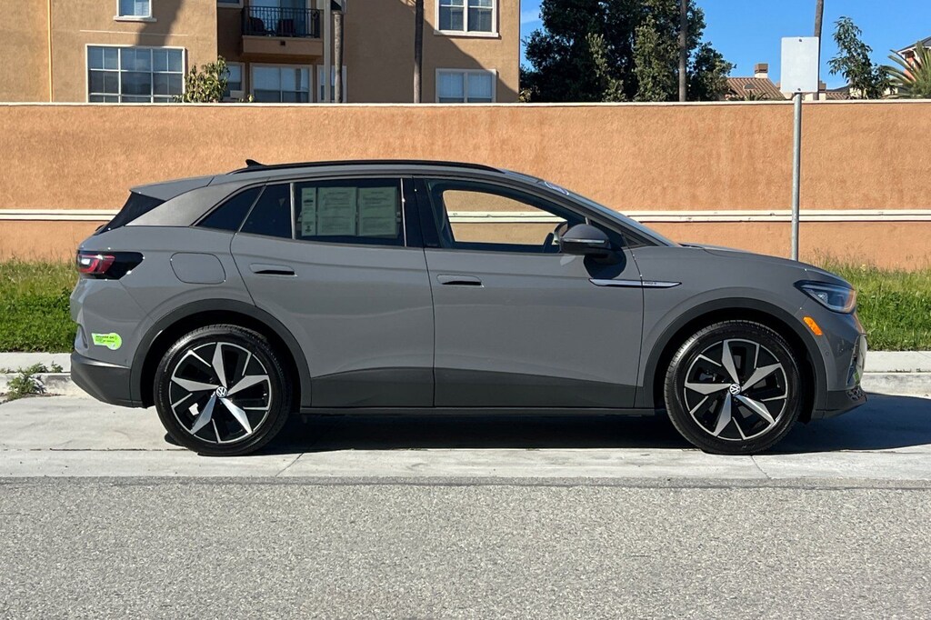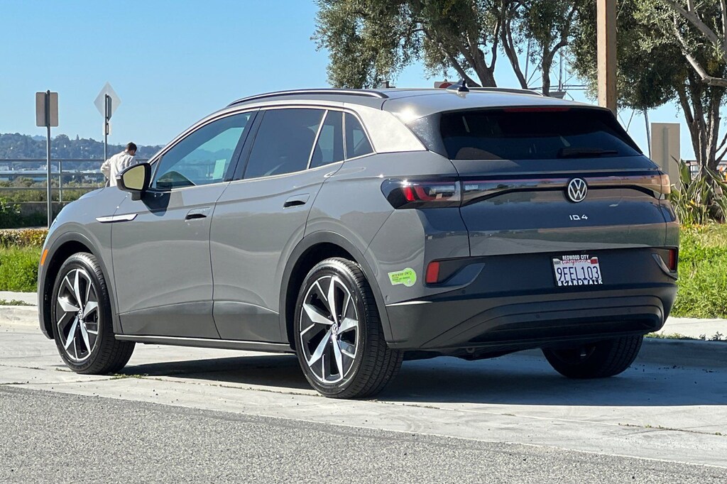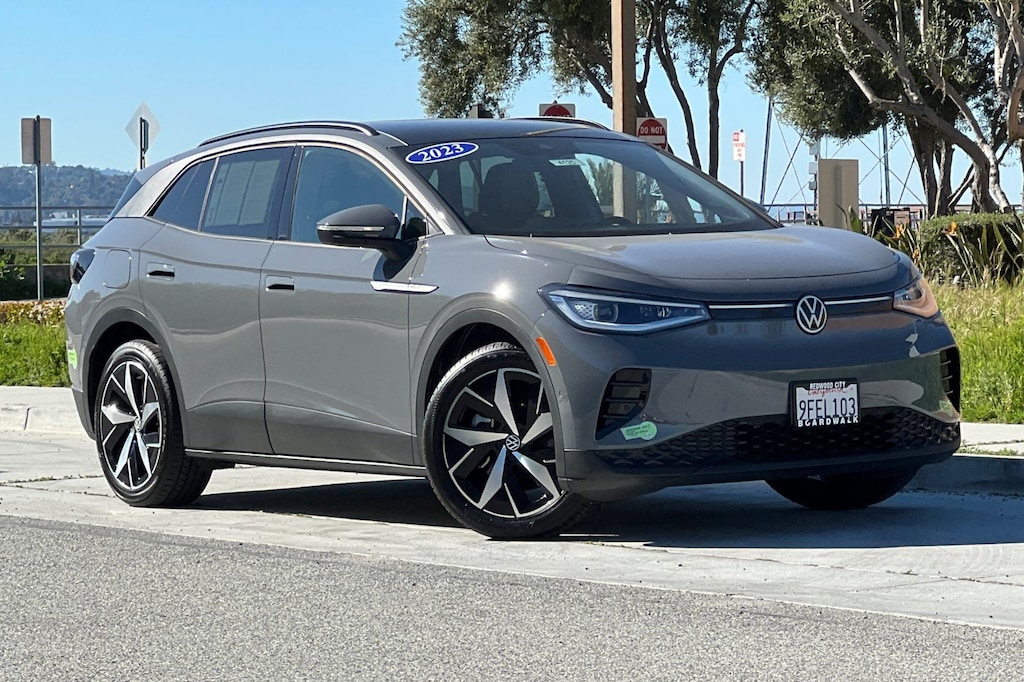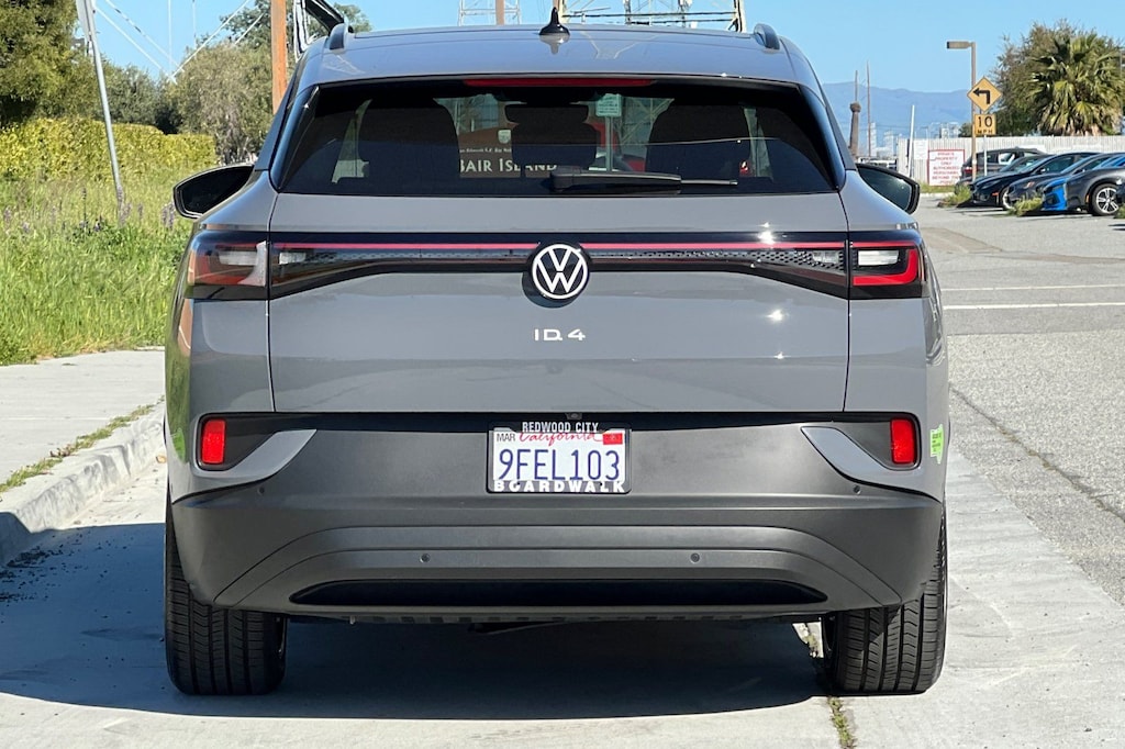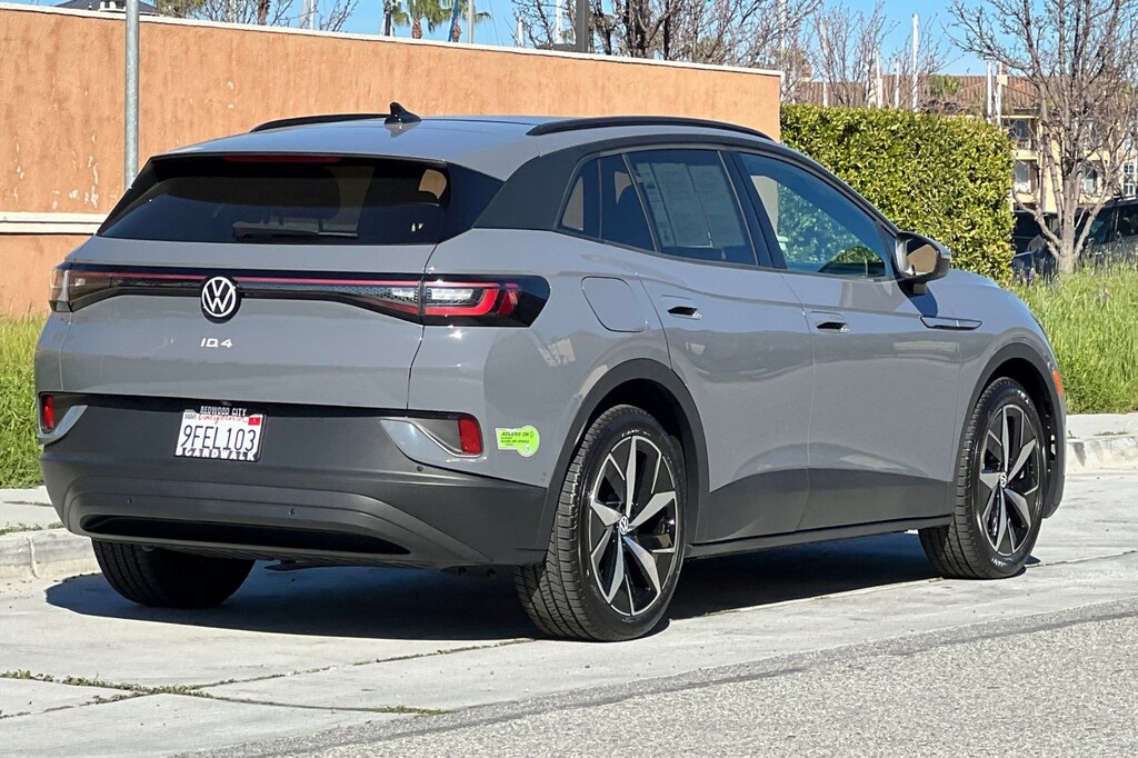 CARFAX One-Owner. Clean CARFAX. Pure Gray 2023 Volkswagen ID.4 Pro S RWD. Powered by a Single-Speed Automatic Electric Motor. Equipped with Electronic Stability Control, Heated Front Seats, Navigation System, Perforated V-Tex Leatherette Seating Surfaces, Power Liftgate, Discover Pro Max w/12" Touchscreen, Rear Parking Camera, Remote keyless entry, Spoiler, VW Car-Net Safe & Secure (enrollment needed), and 20" 5-Spoke 2-Tone Machined Alloy Wheels.